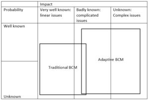 Is het Adaptive BC voor mij hiermee afgeschreven? Neen, helemaal niet. Omdat ze een antwoord bieden voor kwesties van een ander deel van het spectrum van disasters: mogelijks, mits een stevige fundering, kan hier een oplossing gedistilleerd worden voor moeilijke / gecompliceerde en complexe systemen waar traditioneel BCM volgens mij het moeilijker heeft om een antwoord te bieden als volgt: